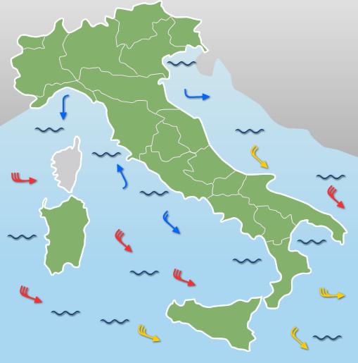 Al Nord: Al mattino molte nuvole in transito con fenomeni sparsi su settori alpini e prealpini, con neve fin verso i fondovalle, piogge sparse anche sulla Liguria. Al pomeriggio deboli nevicate sulle Alpi occidentali, più asciutto altrove con nuvolosità in transito. In serata e nottata si rinnovano condizioni di tempo asciutto con cieli irregolarmente nuvolosi, deboli fenomeni solo sulle Alpi occidentali. Temperature minime in aumento e massime in diminuzione. Venti moderati o forti dai quadranti occidentali. Mari mossi o molto mossi.